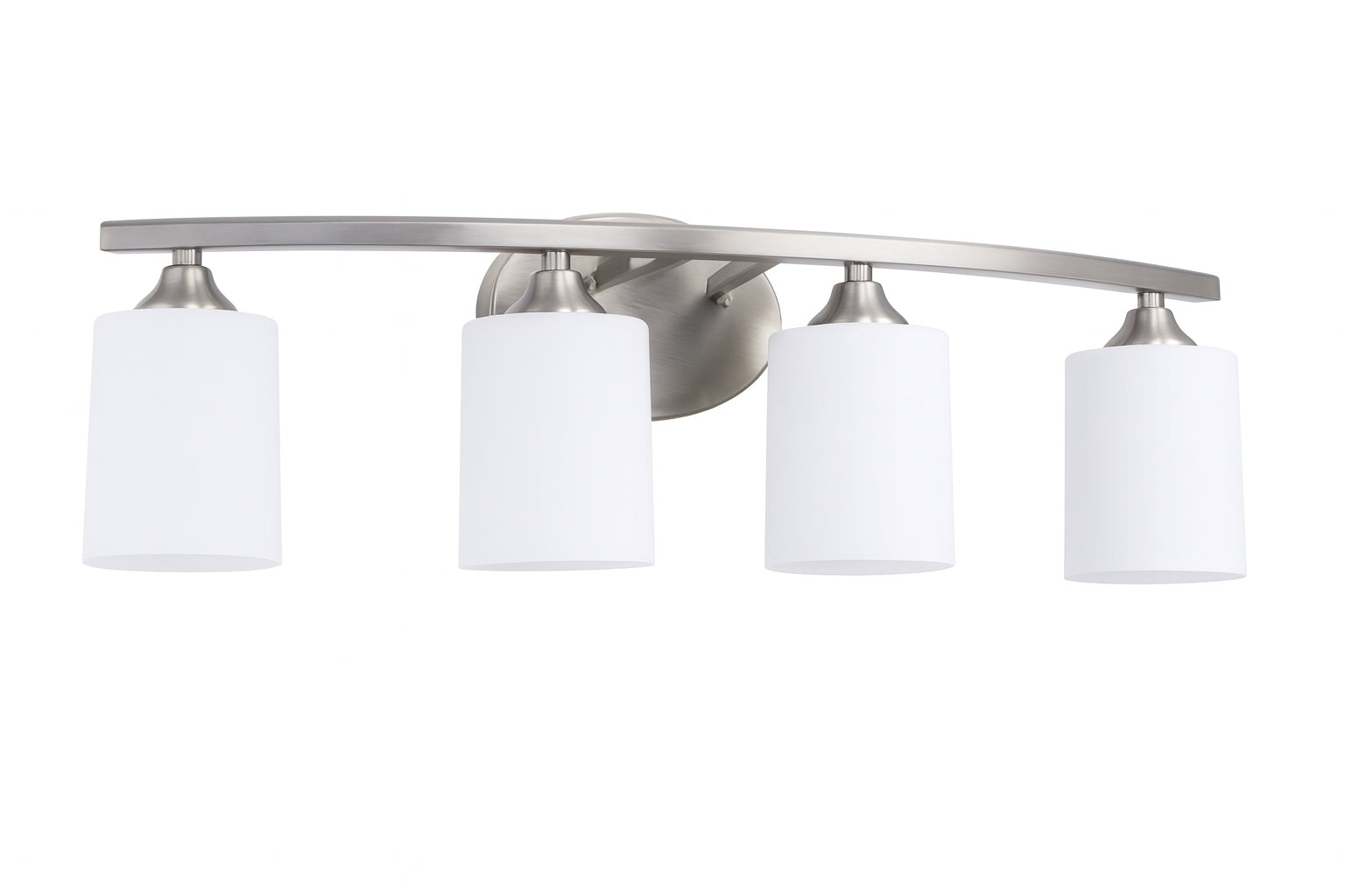 Briignite 28 in. 4-Light Nickel Cylinder Vanity Light for Bathroom Bedroom with Curved Arms and White Glass Shades