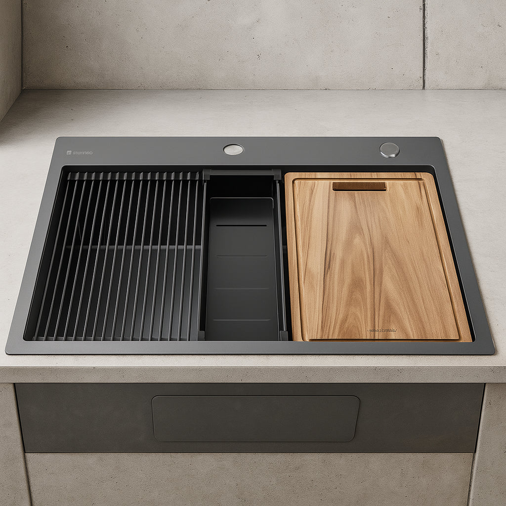 Upgrade your home with the Glacier Bay 33 in. Drop-In Single Bowl 18 Gauge Gunmetal black Stainless Steel Workstation Kitchen Sink with Spring Neck Faucet. Designed for durability and style, this model ACS3322A1T-FS blends functionality with a modern look.