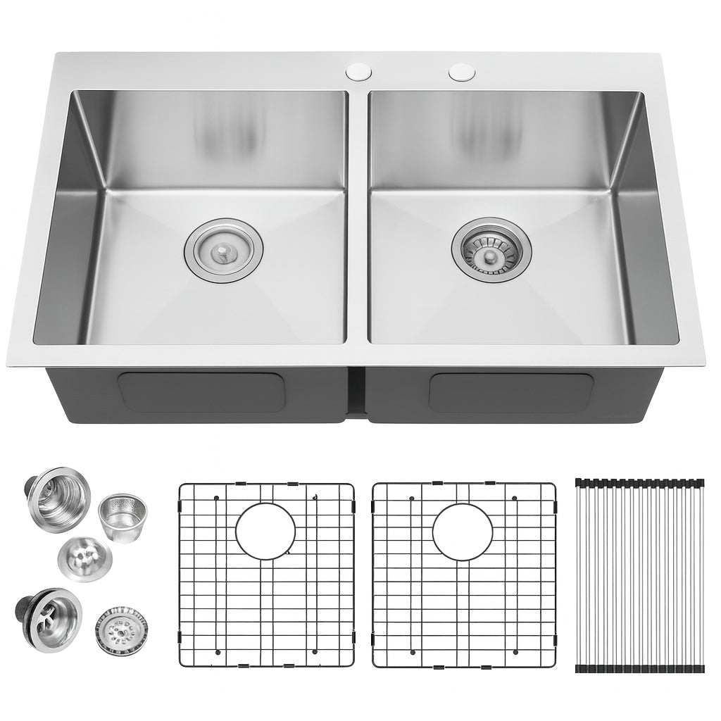 LORDEAR 33 in. Drop in Double Bowl 16-Gauge Stainless Steel Kitchen Sink with Bottom Grids and Strainer